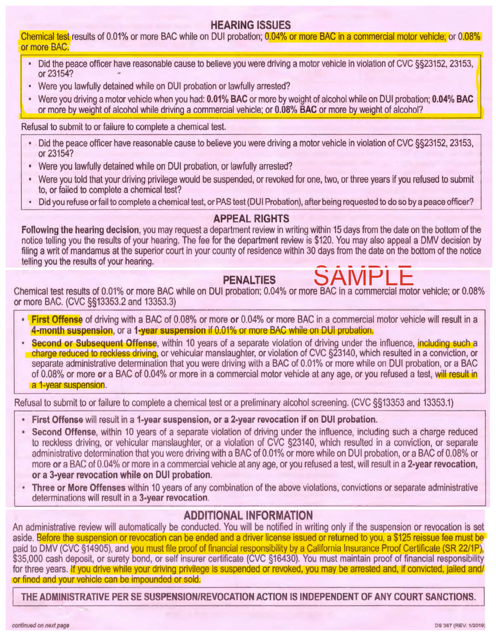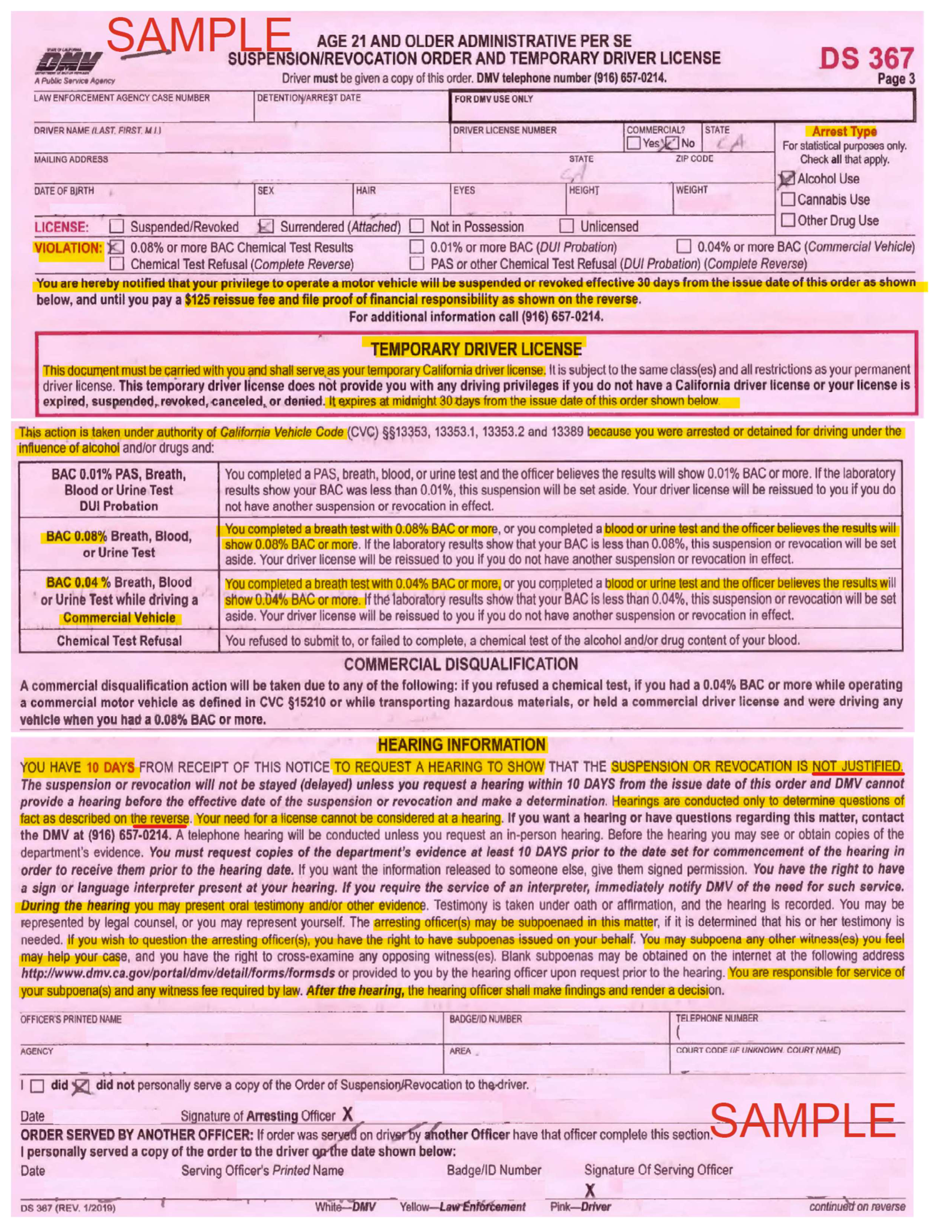 When you're arrested for DUI in California, the officer takes your physical driver's license and hands you a pink-colored document — Form DS 367. This document serves two purposes: